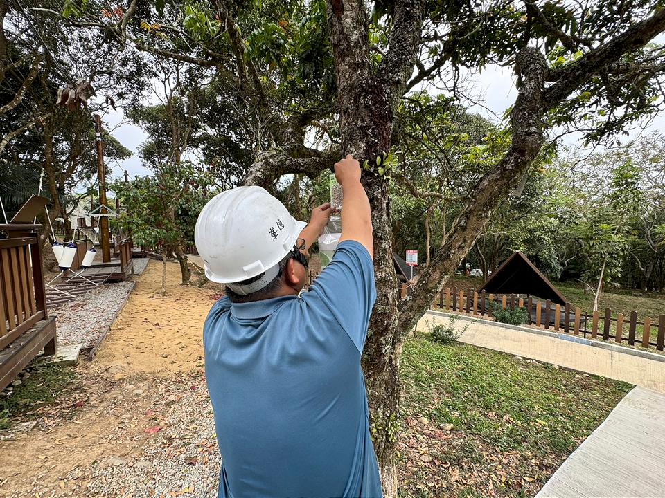 觀旅局人員在步道兩旁釋放平腹小蜂卵卡。翻攝台中市政府