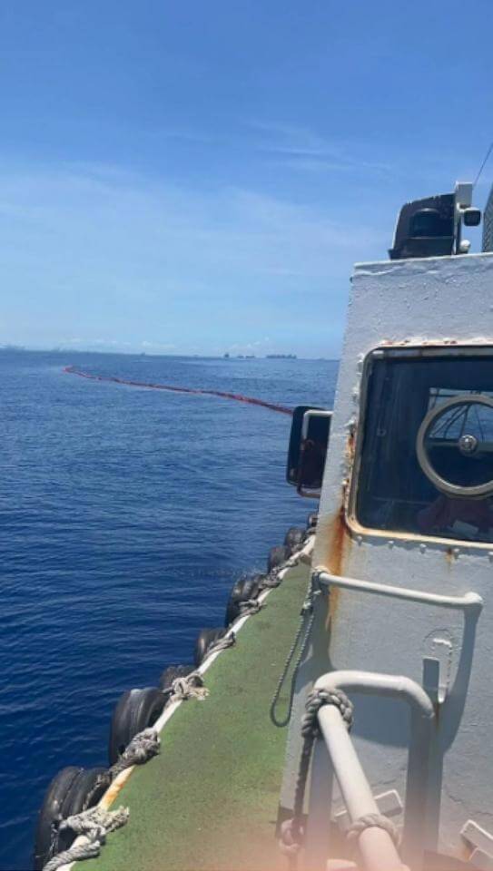 「天使」貨櫃船上油料外洩,緊急以攔油索及吸油棉防治擴散。翻攝高雄港務分公司