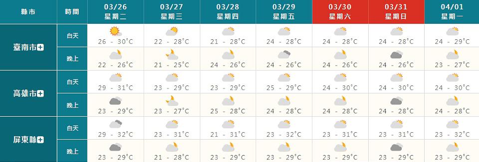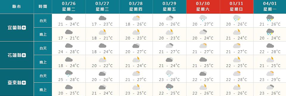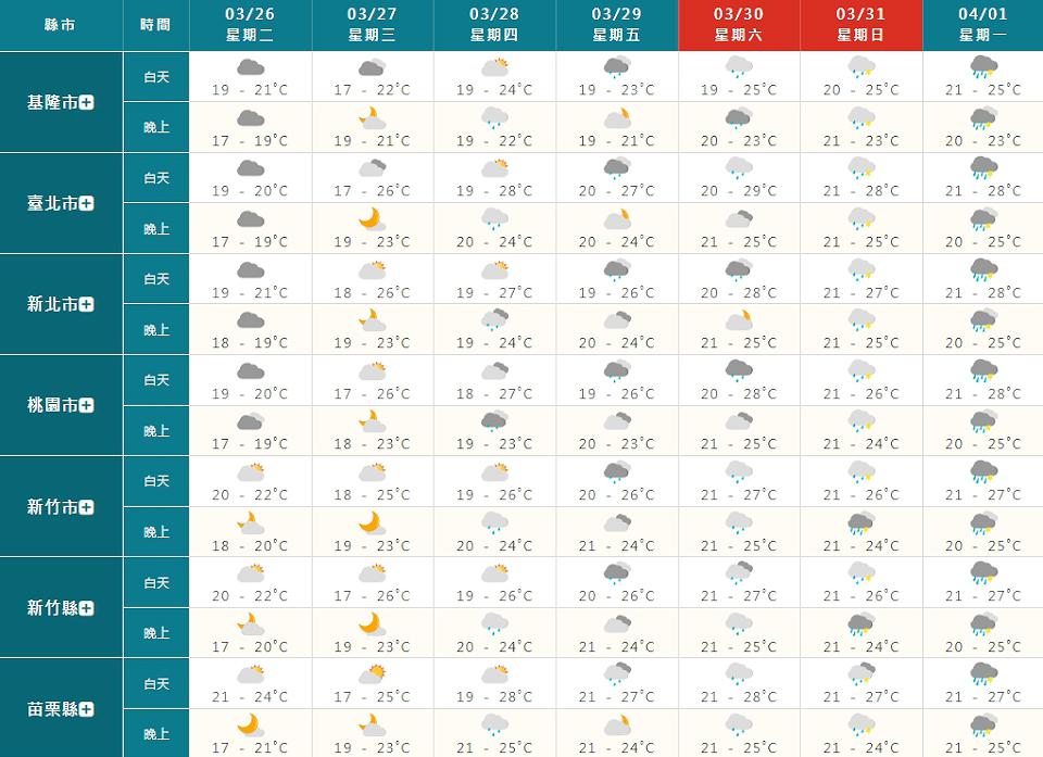 週四(28日)東北季風減弱氣溫回升,北台灣高溫重回28度左右;週四白天起水氣增多,除東半部地區有局部短暫陣雨外,其他地區雲量亦增多;週四晚間至週五(29日)微弱鋒面通過,東半部及北部地區有局部短暫雨,鋒面通過後沒有伴隨顯著冷空氣,故各地氣溫變化不大。