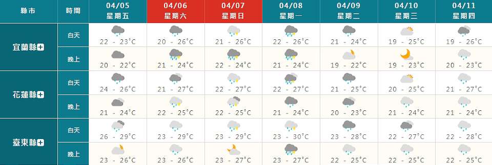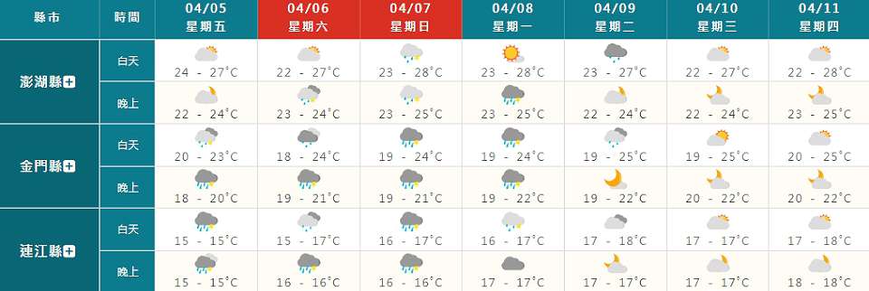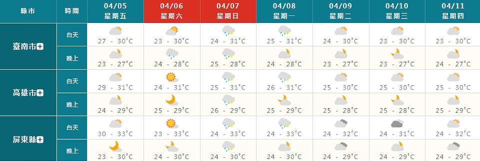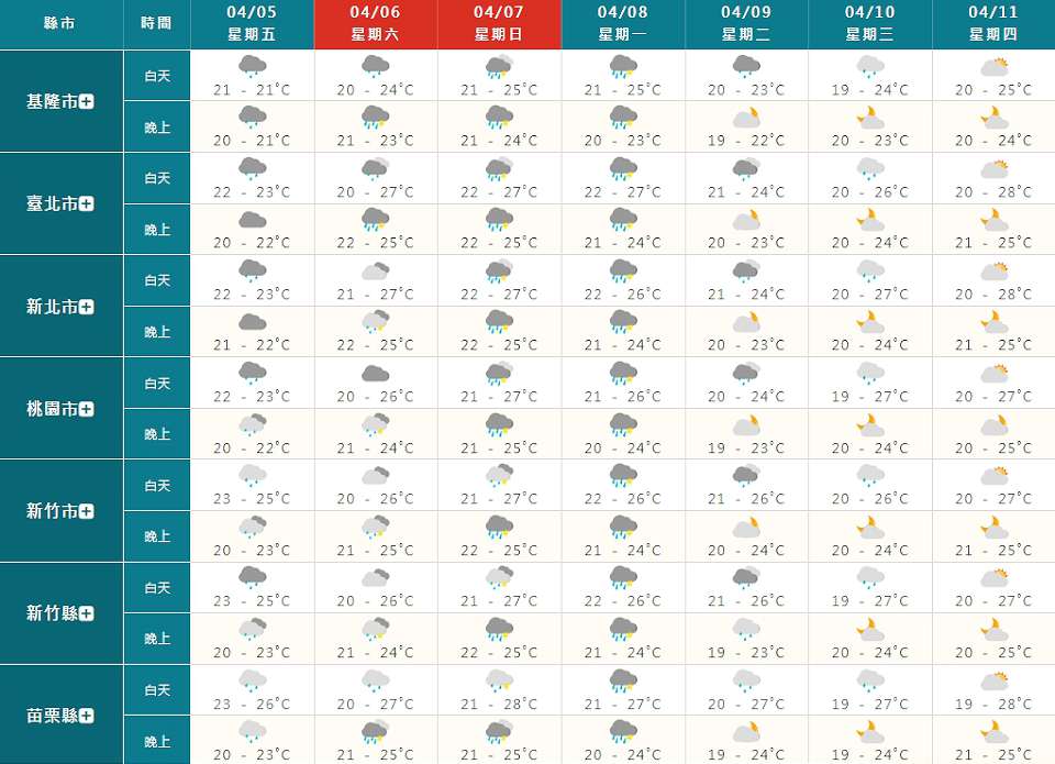 週日(7日)、週一(8日)同樣受到這波鋒面影響,期間各地降雨機率高,全台各地容易有局部短暫陣雨或雷雨;鋒面引發的對流性降雨可能伴隨瞬間大雨、雷擊、強陣風等較劇烈天氣現象,惟後期鋒面位置、結構不確定性大,對台灣天氣的影響程度也仍有變化。