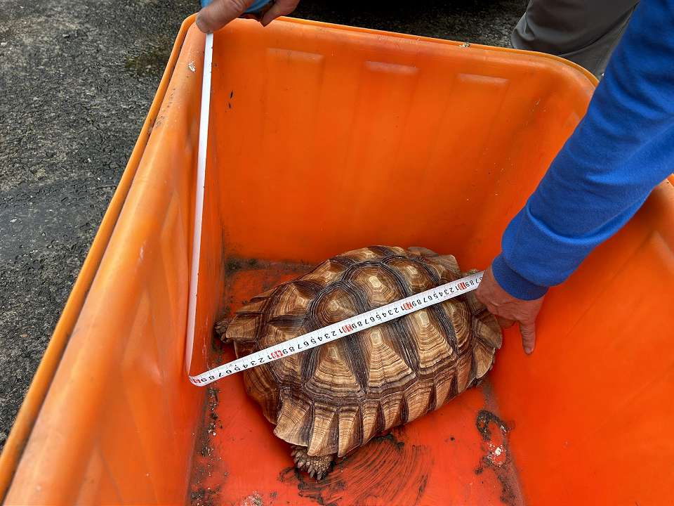 這隻「迷路的象龜」很可能因飼養逃逸或棄養,才會誤闖民眾菜園覓食被發現,農業處表示,新竹縣野生動物救傷隊前往接收,經目測外觀無受傷情形,健康狀況良好,量測甲長約42公分,重量約9公斤,目前先由野生動物救傷隊暫養收容。如果有飼主發現家中象龜走失,可以盡速聯繫後領回。