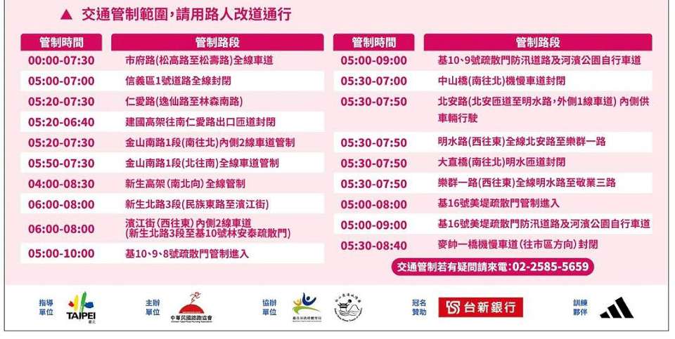 「2024 TAISHIN WOMEN RUN TAIPEI」路跑將在14日(日)5時至10時登場,台北市警察局將針對路跑行經道路進行交通管制,因此提醒會經過路跑路線的用路人請提早改道,管制範圍內公車候車處暫停服務。