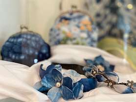 中華民國植藍美學協會理事長賴蕾卉說明,這次作品參展的會員有16位,作品創作最高齡為72歲的李淨蘭,她以今年的生肖年龍為創作發想,運用大菁,棉繡線、珠子等媒材,採以縫紮、手蜘蛛絞、軍隊絞藍染、亂針刺繡等手法,創作出活靈活現具有圖像的染藝作品。這次參展會員的作品有來自台灣各地,包括遠自馬祖的陳素雲以黃草染出手染線再織出如浪花美麗的花朵及對孫女滿滿祝福的百福被、也有來自台東、花蓮地區與台灣各地會員的作品,在這次展覽中可以看到除了一般大家所熟悉的大菁、薯榔為染料外,也有以洋蔥皮、茜草根、福木、墨水樹心、花、葉等進行染料萃取與創作。而運用的手法有絞染、臘染、綁紮染、套染、防染留白、層次藍染、花葉敲拓染、縫紮、唐松絞藍染、手蜘蛛絞等,不同的手法,各具有不同的特色與美感,作品除了衣物外也有一些具實用與美觀的配件和圖像作品,非常值得欣賞。