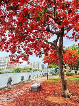 市府公園處補充,鳳凰木是蘇木亞科的多年生落葉大喬木,適合生長於全日照且溫暖的環境,是城市常選用的行道樹種類之一。夏季高雄的街頭、校園、綠地,金黃的阿勃勒及印度紫檀、浪漫的大花紫薇與艷麗華美的鳳凰木相互輝映,市容景觀精采紛呈,奼紫嫣紅的行道樹花毫不吝惜地裝飾著城市每個角落,歡迎市民朋友走出戶外感受花團錦簇的美好。