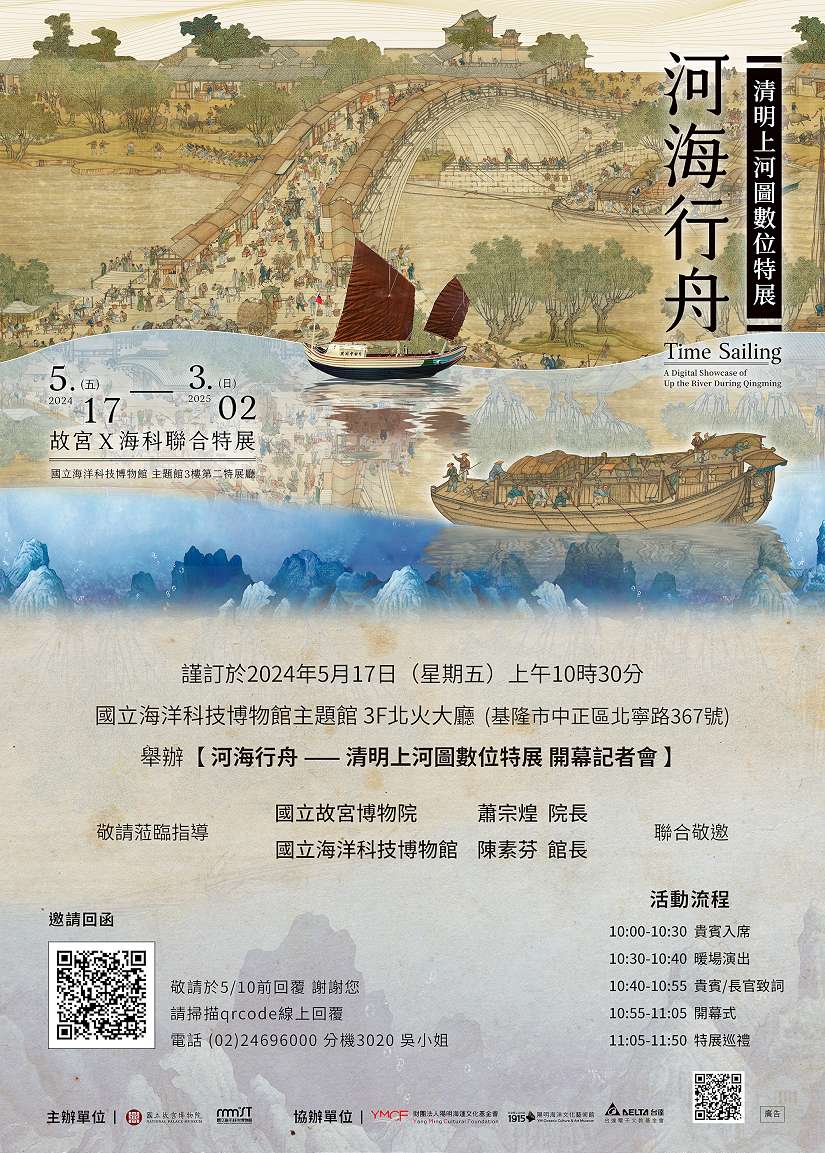 《河海行舟-清明上河圖數位特展》結合故宮「古畫動漫—清院本清明上河圖」與海科館的研究典藏特色,引領民眾經由此特展走入人類自古與河共生共榮的歷史,看見古人智慧與工藝美學的同時,亦反省今日隨著舟船、漁法技術進步,人們對河海資源的掠奪。本次特展也特別邀請財團法人陽明海運文化基金會贊助11件中式古船模型展示,透過基金會典藏基隆在地木船工藝達人曾樹銘老師經典作品,講述自古以來各式舟船運載著人們的生活甘苦回憶,流動著各行各業的繁榮盛況,也因百川匯集成河海大洋,人類不停探索追求自由夢想的海洋精神,得以無所畏懼跨越艱鉅的波濤洶湧,抵達嚮往的大洋彼方。