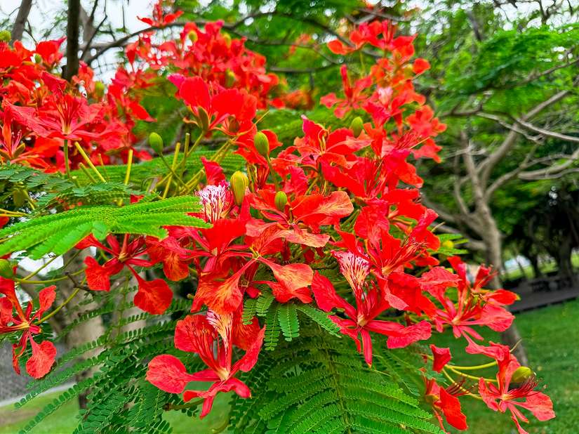 鳳凰木又名火樹、火焰樹,屬落葉大喬木,樹高可達20公尺,性喜高溫、日照充足的環境,在陽光充足的條件下致使更繁茂生長,且日照越充足,所開花朵會越鮮豔,其花期為夏季,每當鳳凰木盛開之際,代表到了驪歌初唱的季節,鮮紅的花朵如火焰般燃燒,讚詠著熱情、活力的青春,鳳凰木開花模樣,彷彿生動的鳳凰在濃綠河濱草地上飛舞而耀眼奪目。