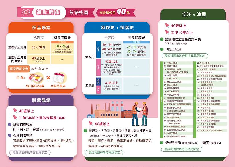 桃園市自112年3月1日起,針對設籍桃園、40歲以上具有「菸品暴露」、「相關疾病史及家族史」、「職業暴露」及「空汙及油煙」等4大高風險族群提供低劑量電腦斷層掃描肺癌篩檢,截至113年5月22日逾2萬6,000人完成篩檢,其中近9,000人為43處工業區工作10年以上者,從工業區受檢族群中找出41案確診肺癌(3案第零期、35案第一期、1案第二期、2案第三期),另有509案經影像判讀建議進一步追蹤。