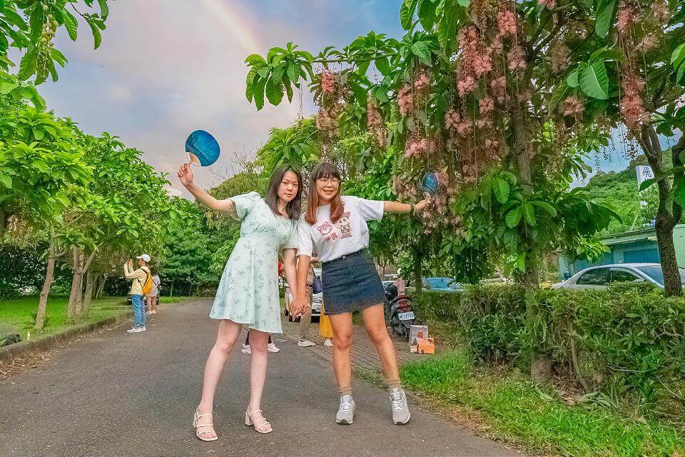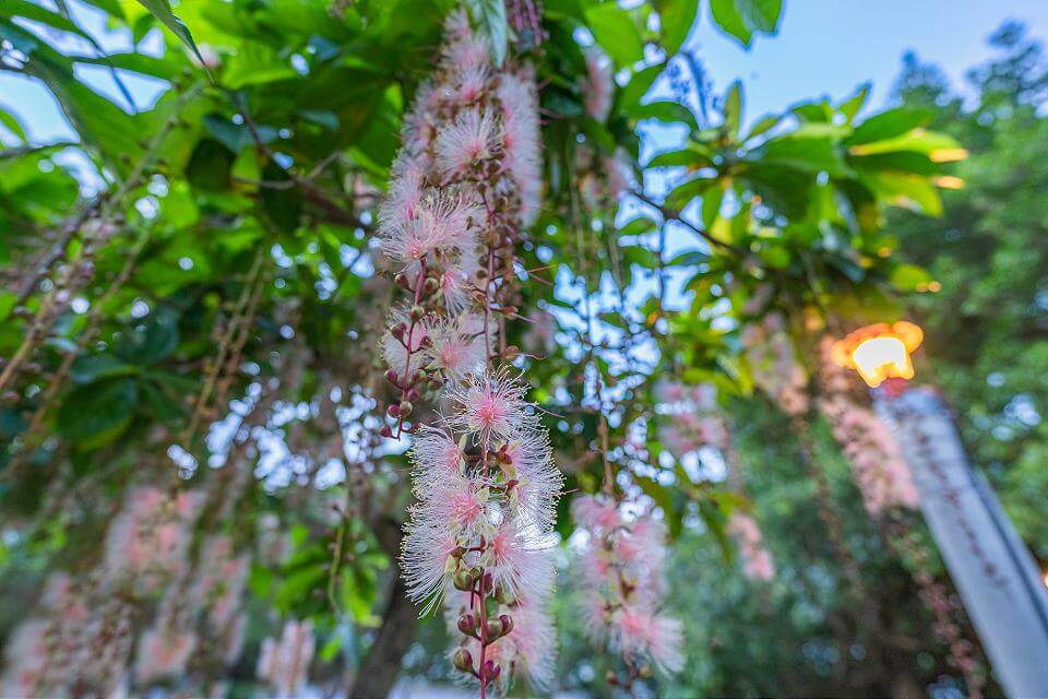 新北市八里龍米河濱公園近日綻放著,有夏日煙花之稱的台灣國寶級原生種「穗花棋盤腳」,接近傍晚日落時分,朵朵蓄勢萌發的花苞便會逐漸展開,直至夜幕低垂便如煙火般恣意盛放,今年花期預計約可至7月底,民眾可以乘著夏日晚風,或漫步或騎乘自行車欣賞,還可一飽八里河濱沿線水岸風光,大啖八里沿線美食好滋味。
