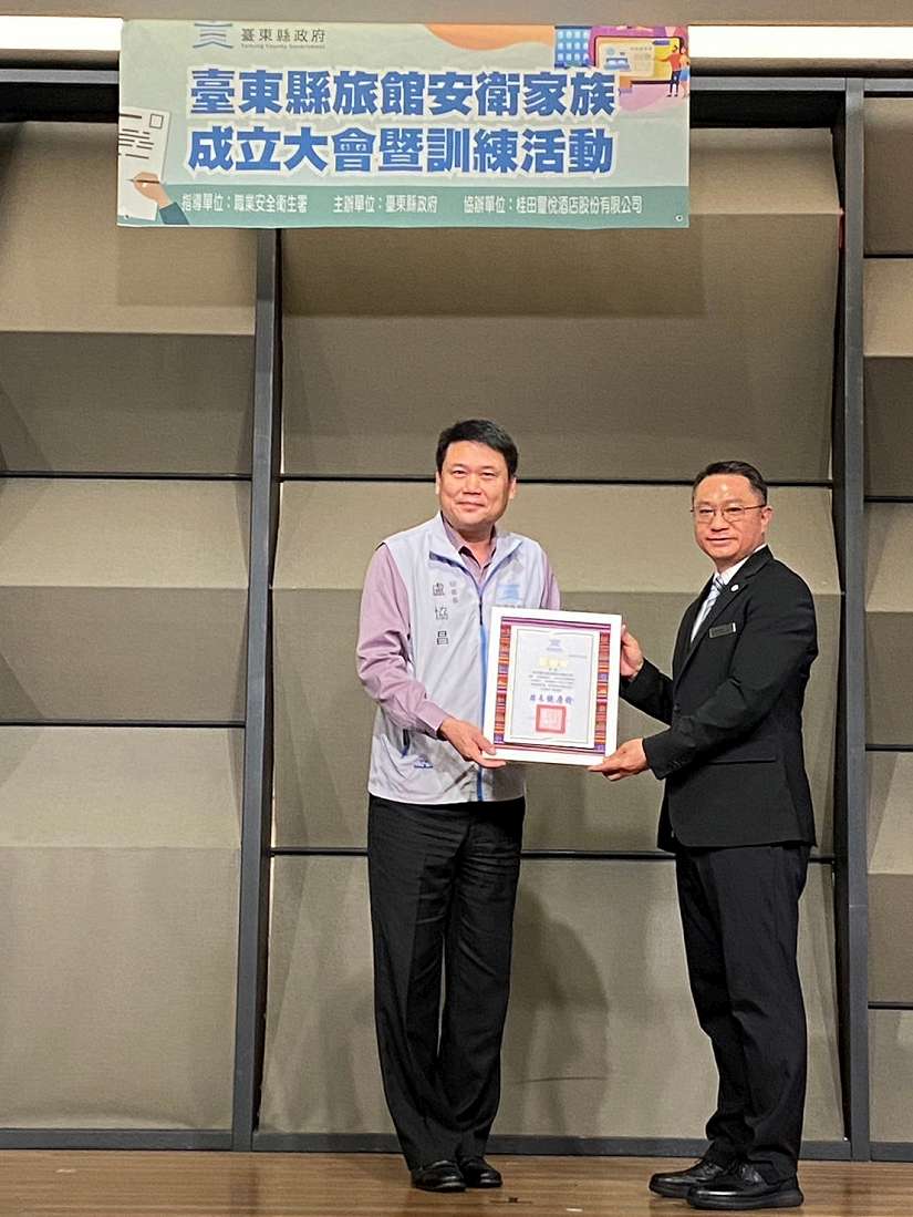 「有良好的工作環境才能留住好人才,並提升企業競爭力」,臺東縣政府於29日下午13時40分在桂田璽悅酒店舉辦「旅館安衛家族成立大會暨訓練活動」,縣府盧協昌秘書長也特地到場勉勵,肯定核心企業的「桂田璽悅酒店股份有限公司」,帶頭提升中小企業之職業安全衛生知識及意識,也感謝臺東縣旅館商業同業公會的協助,讓家族能凝聚起來,使家族成員積極參與各項安衛活動及教育訓練,希望透過「大廠帶小廠」的模式,讓核心企業帶領20間中小企業,共同來改善縣內旅館業的職場安全防護設備和措施並提升工作環境。