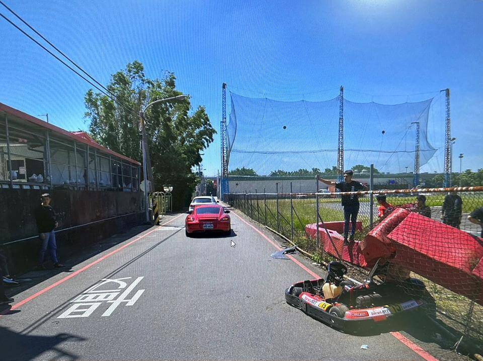 保時捷跑車行經卡丁車場旁時,遭衝破護欄的卡丁車撞上。畫面讀者提供