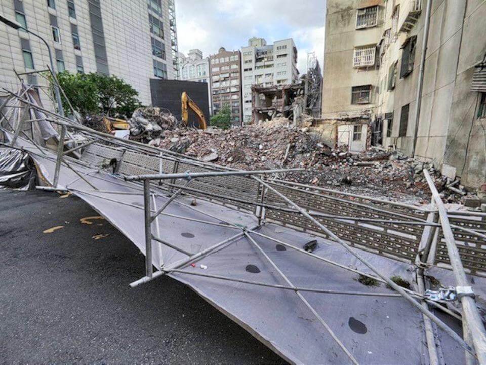 台北市中正區1處建築工地,日前疑似因為風勢強大,整個鷹架圍籬應聲倒下,波及停放一旁的機車與電纜線,所幸當時沒有人路過,但道路卻因此受阻,中正二警分局員警立即封鎖道路,讓建築工地迅速恢復道路暢通。