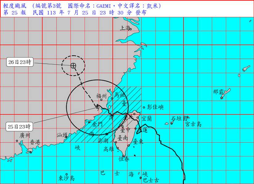 中央氣象署25日23時預報,凱米颱風中心位置在北緯 25.5 度,東經 118.9 度,即在馬祖的西南方約 130 公里之處前進方向:以每小時16公里速度,向北北西進行,中心氣壓:980百帕、近中心最大風速:近中心最大風速每秒 28 公尺(約每小時 101 公里),相當於 10 級風、瞬間之最大陣風:瞬間最大陣風每秒 35 公尺(約每小時 126 公里),相當於 12 級風、暴風半徑:七級風平均暴風半徑220公里、(西北側110公里、東北側230公里、西南側190公里、東南側330公里),十級風平均暴風半徑-公里,預測26日23時的中心位置在北緯 28.5 度,東經 117.2 度,即在馬祖的西北方約 380 公里之處。