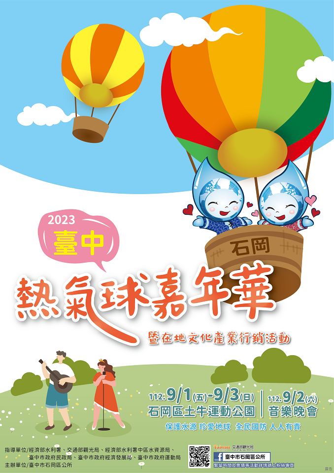 邁入第三屆的台中石岡熱氣球嘉年華,9月1日至3日將在石岡區土牛運動公園盛大登場,活動規劃6場熱氣球繫留升空體驗,還有音樂晚會、600秒精彩煙火秀及光雕噴火秀等系列活動,今年活動推陳出新,首次加碼推出大型風箏展演,還有小朋友喜愛的巴西泰迪和琳西造型氣球,360度零死角雙面造型。