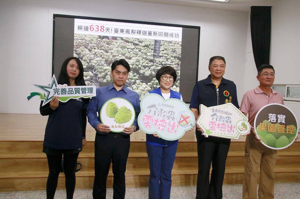 為了符合規範的台東鳳梨釋迦出口至中國,台東縣政府訂定「台東鳳梨釋迦輸往大陸品質管制規範」努力爭取恢復外銷中國大陸市場,終於皇天不負苦心人,經過638天的努力和等待,20日終於迎來喜訊重新叩關成功,讓年底進入產季的鳳梨釋迦恢復銷往大陸。