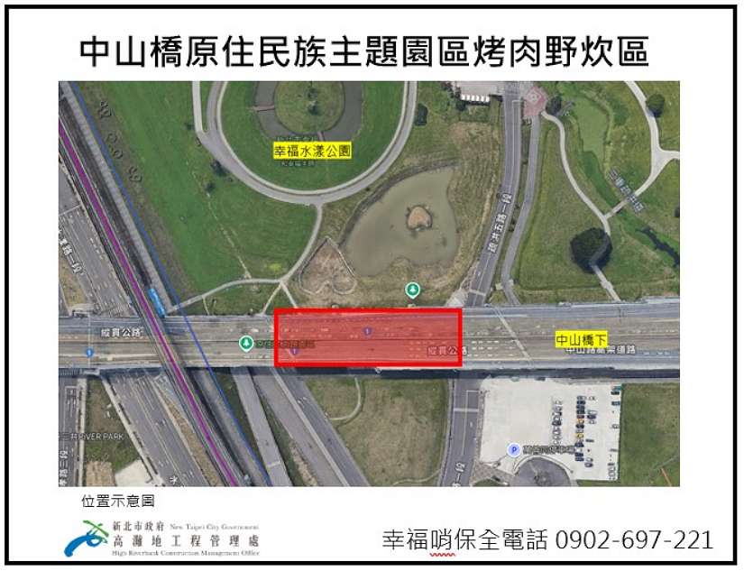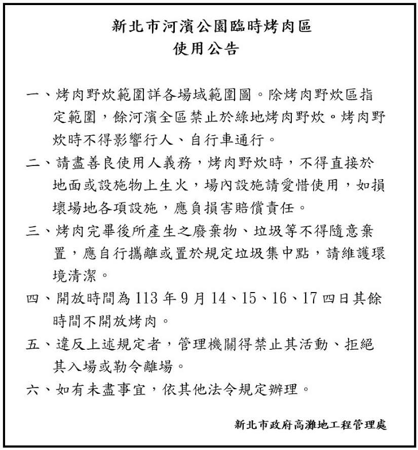高灘處處長張修銘表示,考量新北市幅員廣大,為便利民眾出遊賞月,除了樹林區鹿角溪原住民主題部落公園外,今年於河濱公園橋下增加三重區中山橋下原住民族主題園區、八里區八里文化公園、新店區陽光橋下右岸萊茵公園、板橋區光復橋下賞鳥河濱公園,與永和區福和橋下永和河濱公園等5處,提前於9月14日開放到中秋節(9月17日)共四天,於指定範圍開放供烤肉野炊使用,餘河濱全區禁止烤肉。