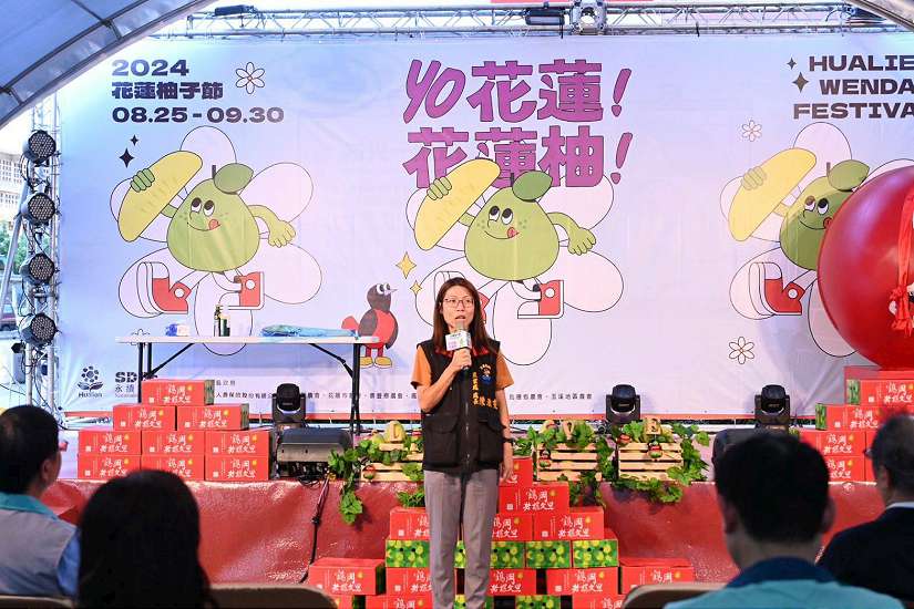 花蓮縣政府農業處長陳淑雯表示,非常感謝大家來參加縣府與新光人壽集團合作的「yo花蓮、花蓮柚」推廣記者會,今年以來,花蓮飽受天災威脅,0403、0423地震,又加上0726凱米颱風來襲,使得觀光旅遊的人次雪崩驟減,對於消費經濟也帶來莫大衝擊。縣長徐榛蔚非常關心農友的收成與收益,在這兩天的活動中,縣府提供消費者買200元變400元的「加倍券」振興活動,一天限量500張,希望透過這樣的活動,刺激消費,為花蓮農友帶來更多的收益。