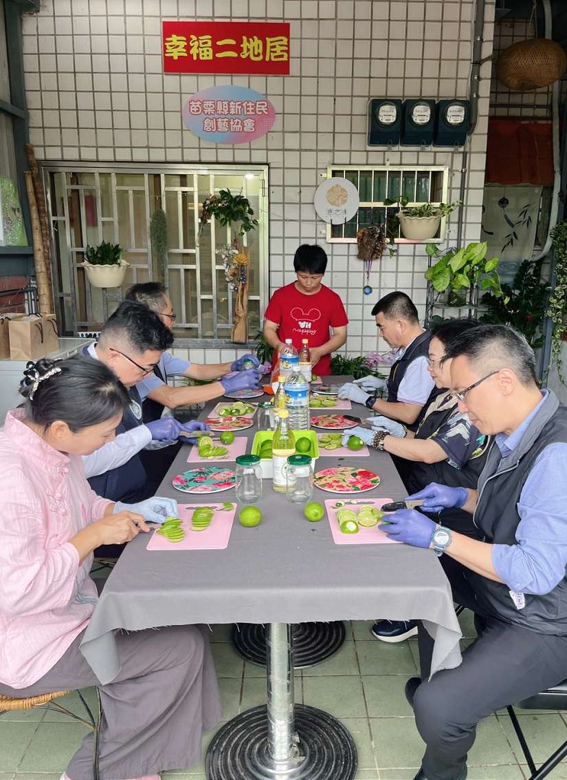 助人為樂 致力協助新住民創業: 一行人接著走訪由來自大陸廣西桂林的張艷君所創立的「苗栗縣新住民創藝協會」。張艷君曾經歷過人生低谷,但在許多人的幫助及鼓勵下,參加新女力加速器創業計畫,用家鄉獨有的輕發酵辣椒醬搭配干貝製成的干貝醬,獲得青睞並拿到獎金創辦手作廚房,開啟創業之路。她保持著積極樂觀的人生態度,總是能將許多創新的想法付諸行動,至今參加政府推動的各項計畫屢次獲獎。張艷君憑著自身豐富的創業經驗及資源整合的能力,幫助許多新住民姐妹創業,也期盼透過創立協會,提升新住民創新及專業技術能力。