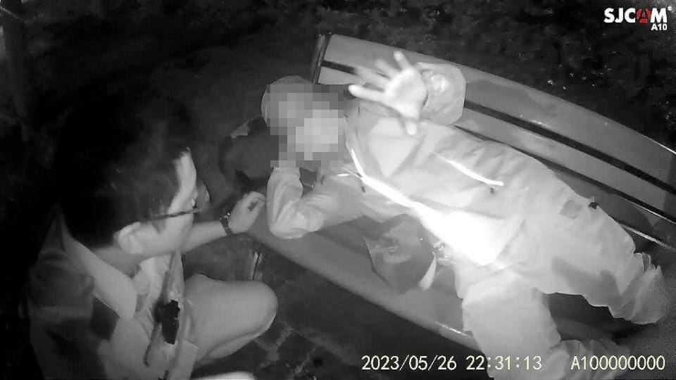 台北市保安警察大隊發現7旬翁「找嘸厝」迷途累癱座椅上。畫面讀者提供