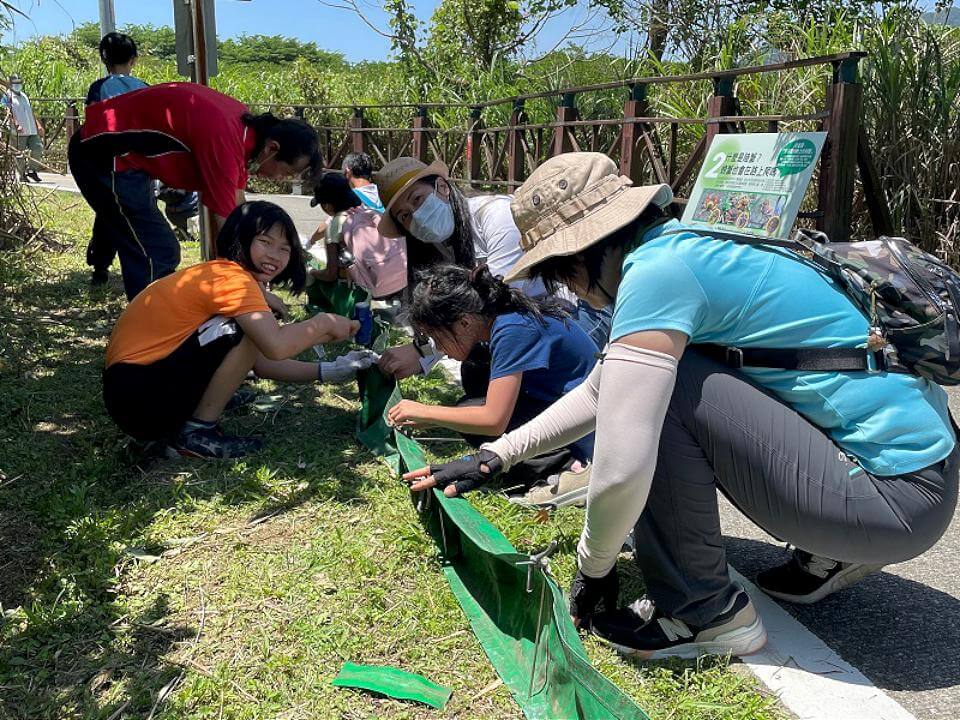 竹圍國小師生及家長,一起動手打造廊道,幫助陸蟹平安回家。翻攝新北市政府