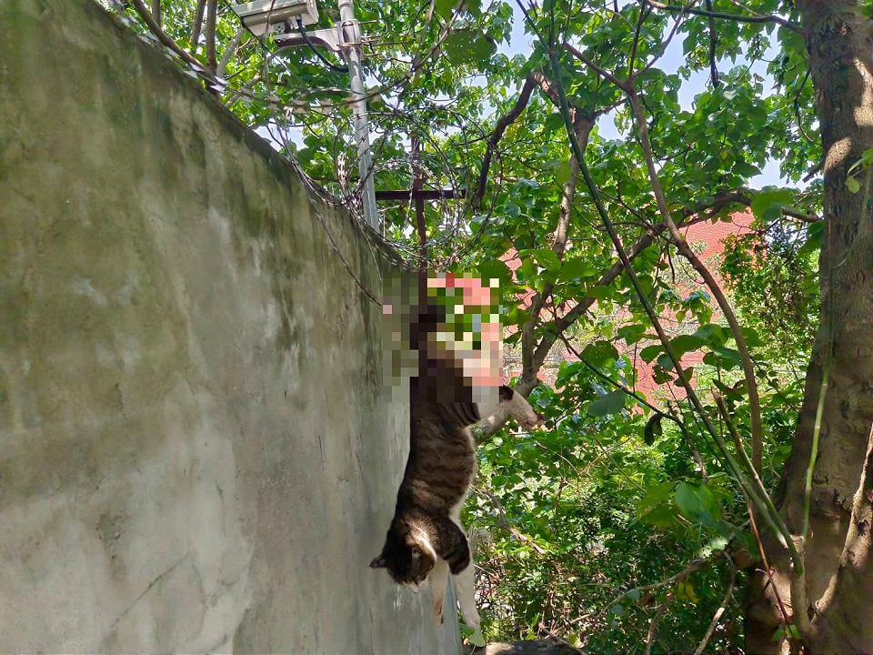 新北市八里區龍形五街處圍牆上,日前有隻街貓受困在營區刀片蛇籠上,新北市動保處人員獲報抵達後,發現街貓尾巴勾住營區圍牆上的刀片蛇籠,吊掛在半空中不斷掙扎,所幸救援過程相當順利,但經檢查街貓尾巴有骨頭斷裂且有組織壞死情況,因此帶往醫療中心治療後,目前恢復健康送往動物醫院等待有緣人認養。