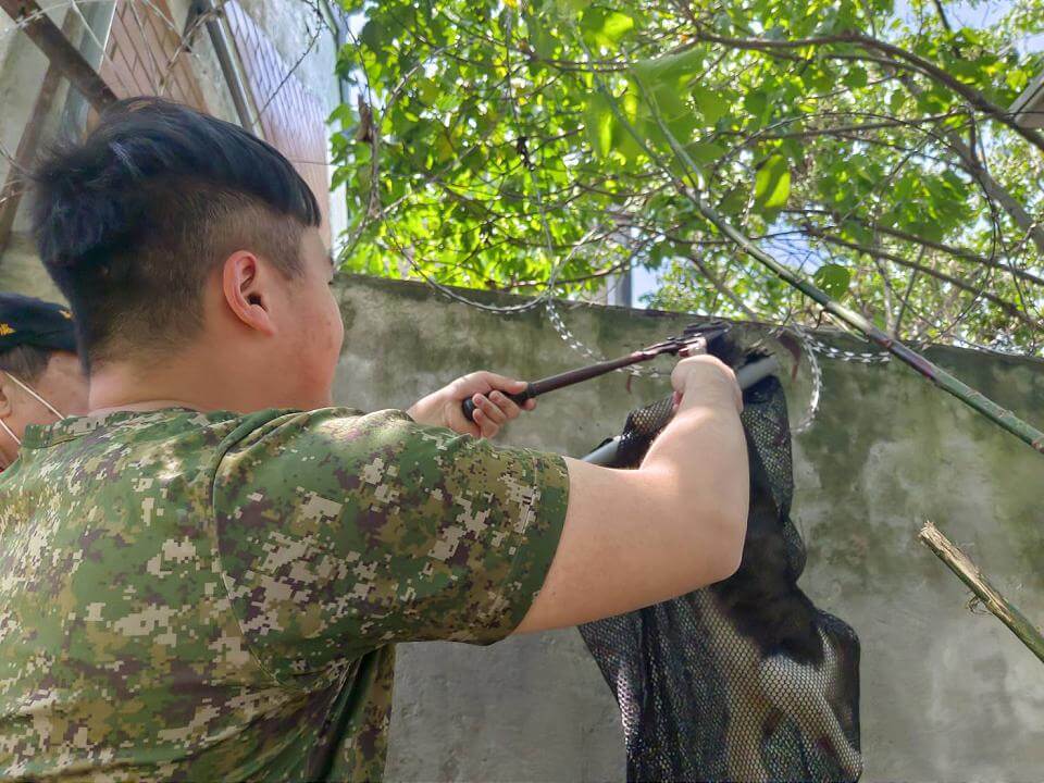 動保處人員與營區人員利用壓力剪協助救助受困胖虎斑貓。翻攝新北市政府