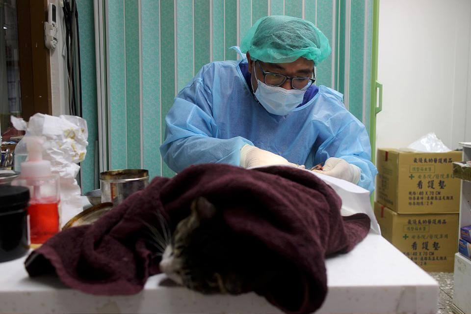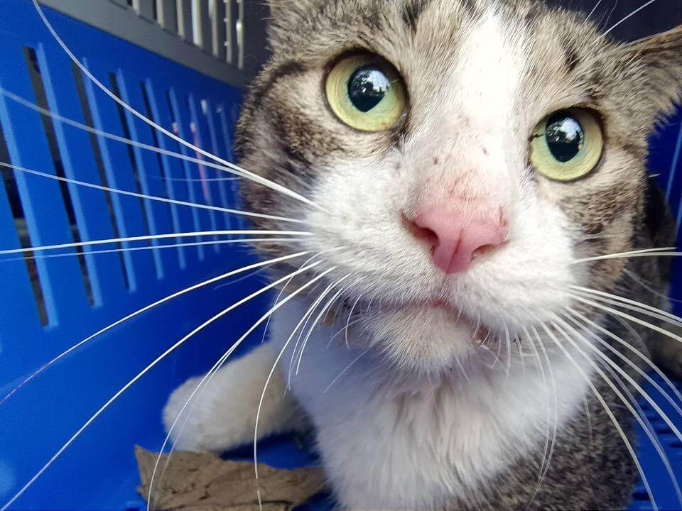 動保處救援人員抵達現場後,發現胖虎斑貓頭下腳上、尾巴受困在圍牆的刀片蛇籠上,隨即會同營區人員利用捕貓網及破壞剪展開救援,為了避免二次傷害,先用捕貓網將胖虎斑貓控制住,由營區人員以油壓剪破壞蛇籠,順利救下後送往動保處毛寶貝醫療中心進行檢傷醫療,發現虎斑貓右前肢有破壞性傷口,尾巴有骨頭斷裂、後1/3處組織出血壞死,經手術後目前已恢復健康,並送往八里動物之家等待認養中。