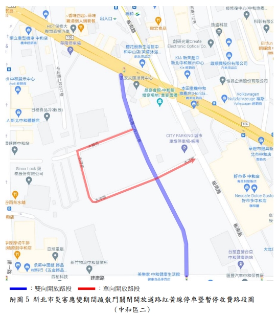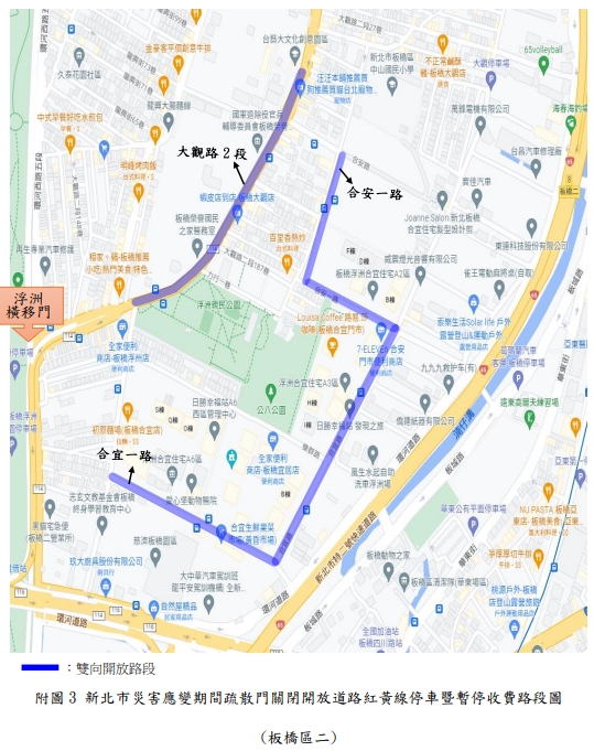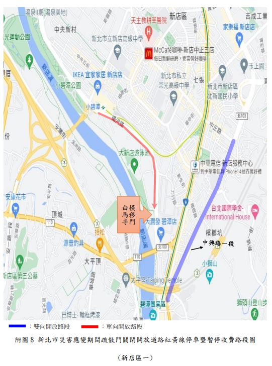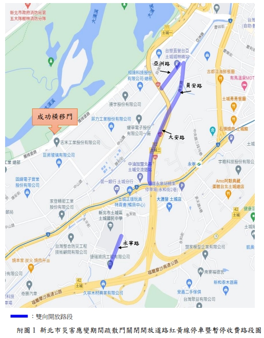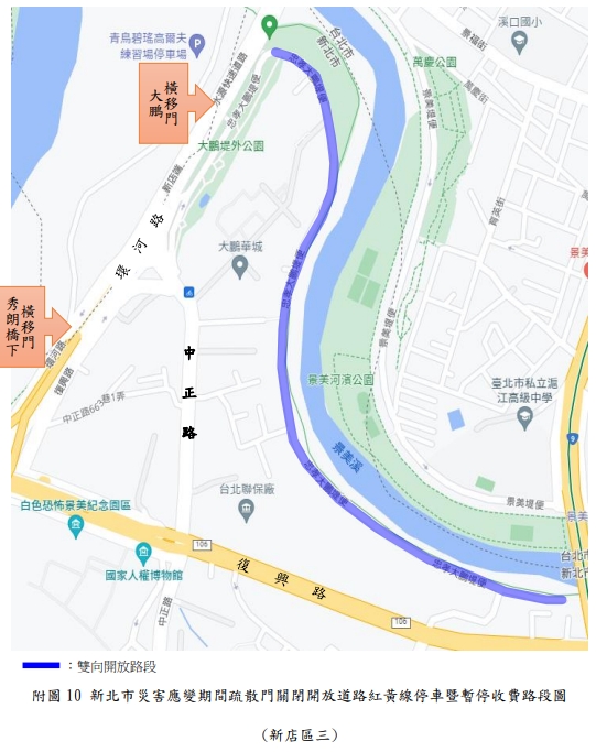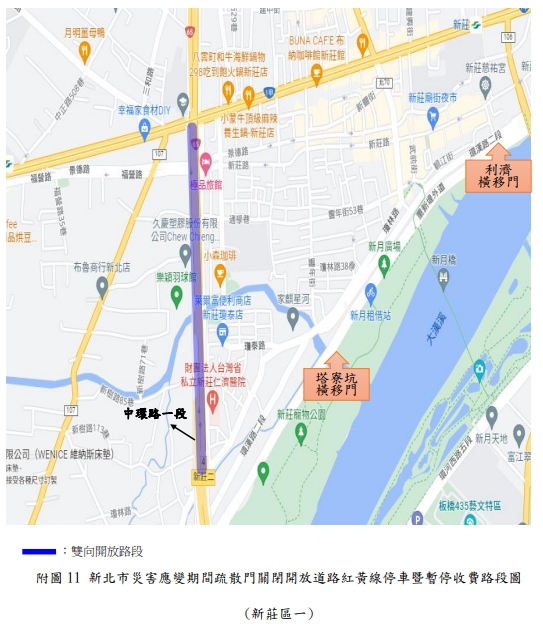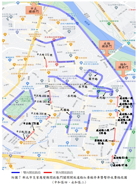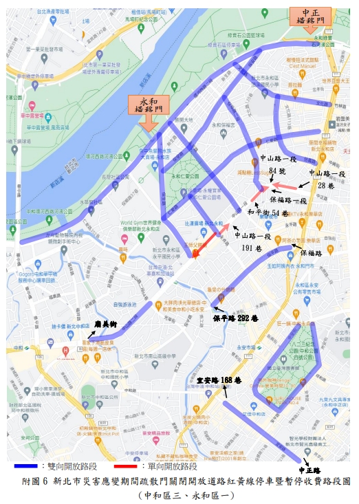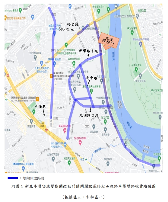 新北市政府表示,新店溪、大漢溪、淡水河流域內之橫移門及二重疏洪道各越堤道路、新莊西盛至三重重新橋堤外便道、樹林柑園至鶯歌堤外便道及板橋大漢橋至城林橋堤外機車道,將在2日上午10時完成關閉,水門周邊部分紅黃線開放停車。(記者黃子瑋/新北報導)