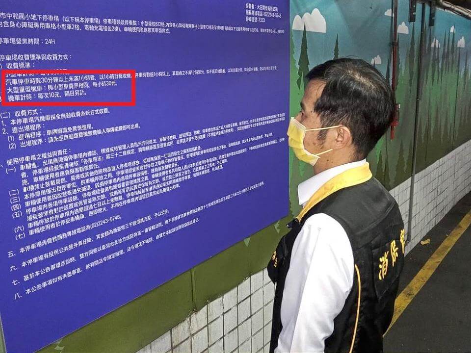 新北市消保官檢視停車場公告欄有明確標示。翻攝新北市政府