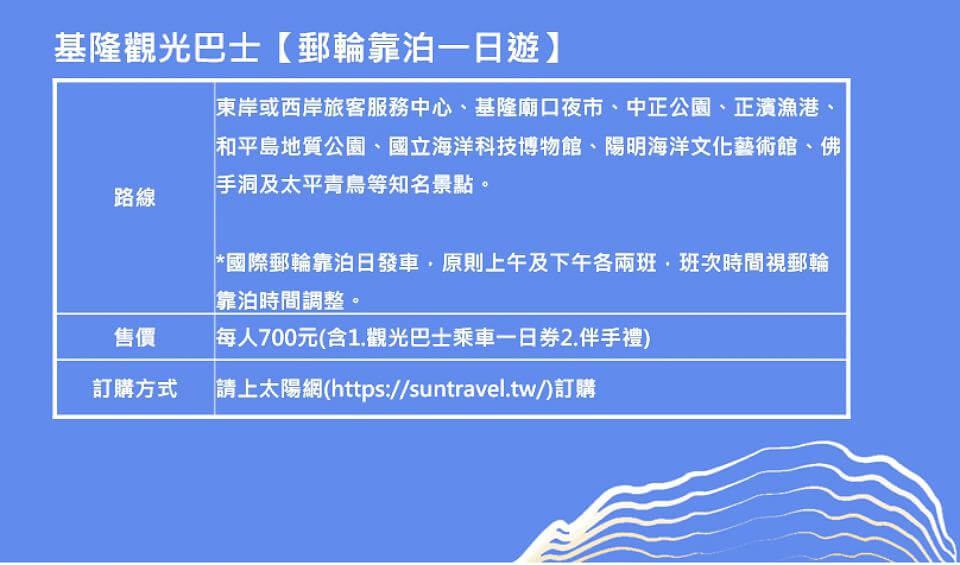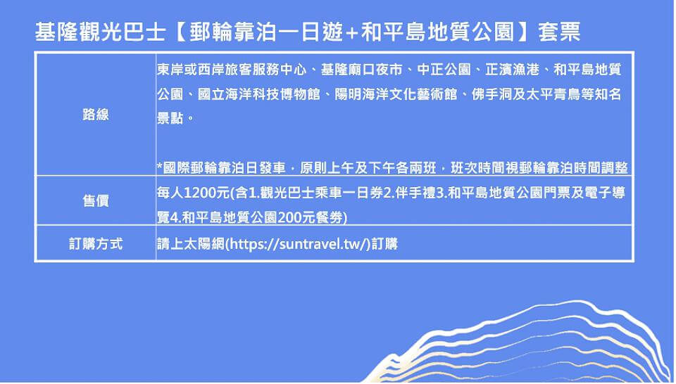 觀光及城市行銷處郭霽處長表示,觀光巴士第一波針對郵輪旅客推出一日劵,配合郵輪到港時間安排發車,每個郵輪靠泊日發車四個班次,無縫接駁搭乘郵輪及看郵輪的遊客暢遊基隆,會行經基隆廟口夜市、中正公園、正濱漁港、和平島地質公園、國立海洋科技博物館、陽明藝術館、佛手洞及太平青鳥等知名景點。