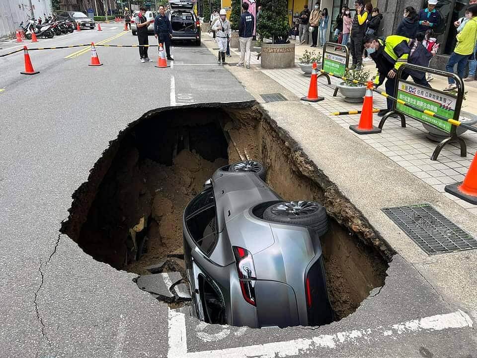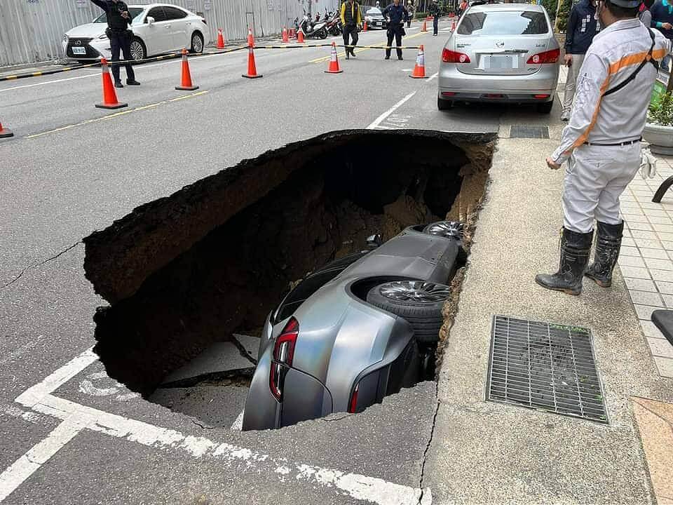 根據當地居民表示,當時聽到相當大的聲響,很多人都跑出來查看,就發現道路出現一個大坑洞,有輛特斯拉轎車直接側躺在坑內,還好車內沒有人受困,不過從坑洞往內看,掏空的區域更大,只剩下薄薄的一層柏油路面支撐,很擔心災情會持續擴大。