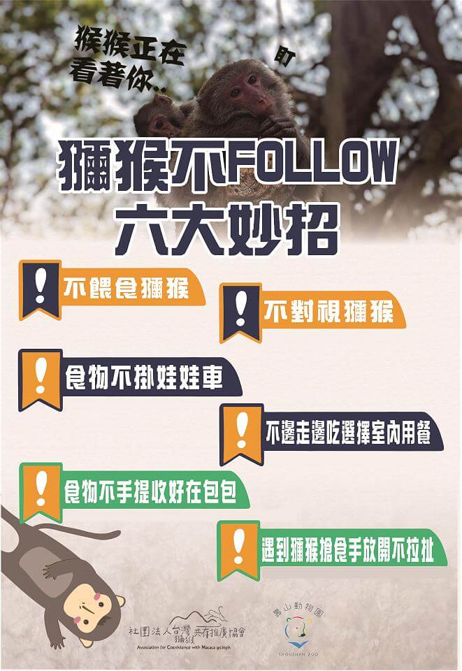 壽山動物園台灣獼猴搶奪遊客手中食物時有所聞,壽山動物園近年與台灣獼猴共存推廣協會合作推廣獼猴保育,讓遊客更了解如何與野生獼猴相處,宣導「獼猴不FOLLOW 6大妙招」食物不手提收好在包包、食物不掛娃娃車、不邊走邊吃選擇室內用餐、不餵食獼猴、不對視獼猴、遇到獼猴搶食手放開不拉扯」等6大妙招。