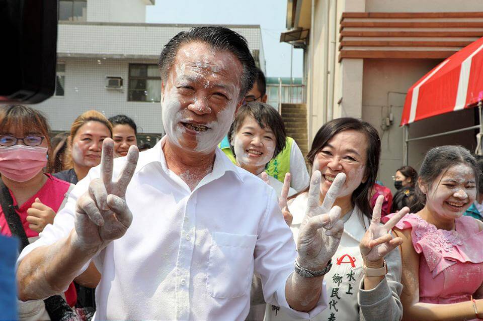 翁縣長也被新住民姊妹以香粉塗滿臉,象徵接受滿滿的祝福。翻攝嘉義縣政府
