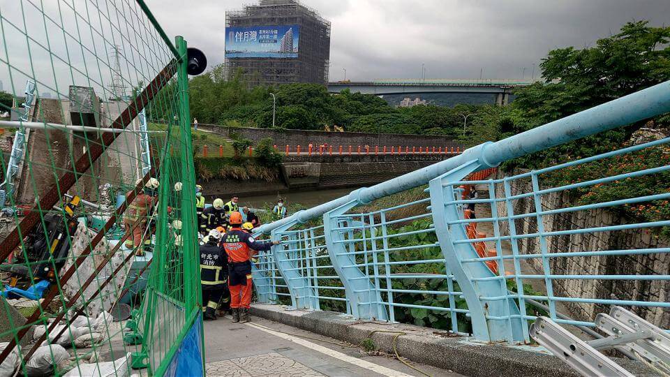 新北市五股區成泰路四段22巷觀音坑溪橋,21日下午正在施工更換鋼索的作業時,橋梁突然發生坍塌,有3名在橋面上施工的工人,隨著橋面一起墜落約5公尺深,現場機具一片凌亂,施工吊車也翻覆在一旁,經消防人員全力搶救,3名工人都生命跡象穩定,陳姓工人(22歲)、李姓工人(52歲)、王姓工人(60歲)順利救出時都僅受到輕傷,以送往醫院救治觀察,至於橋梁為何會發生倒塌,相關單位還要釐清。(記者於余珩維/新北報導)