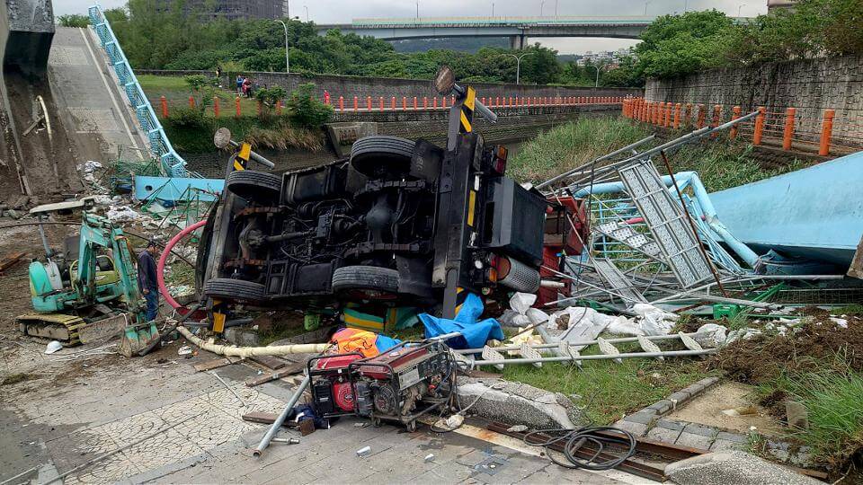 施工吊車因橋梁坍塌翻覆。畫面讀者提供