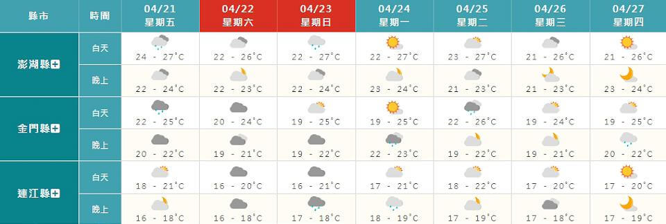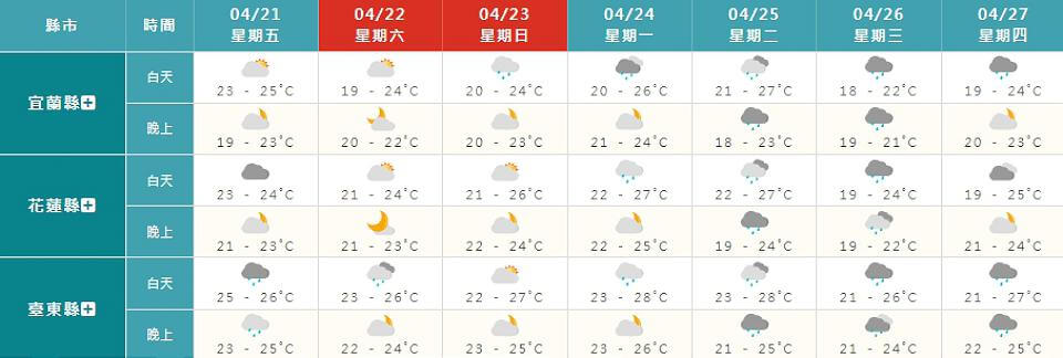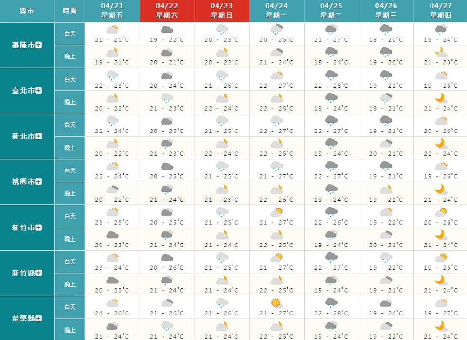週五(21日)鋒面通過,中南部、東部及東南部地區有短暫陣雨,其他地區亦有局部短暫陣雨。北台灣溫度偏涼,高溫在22度到25度左右,其他地區溫度在26度到28度左右。