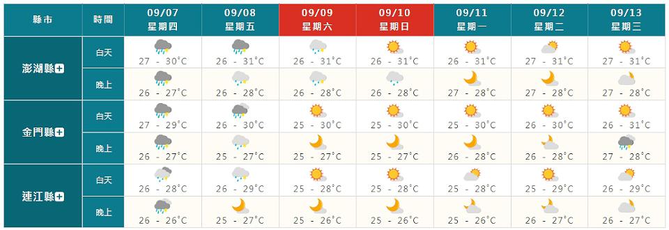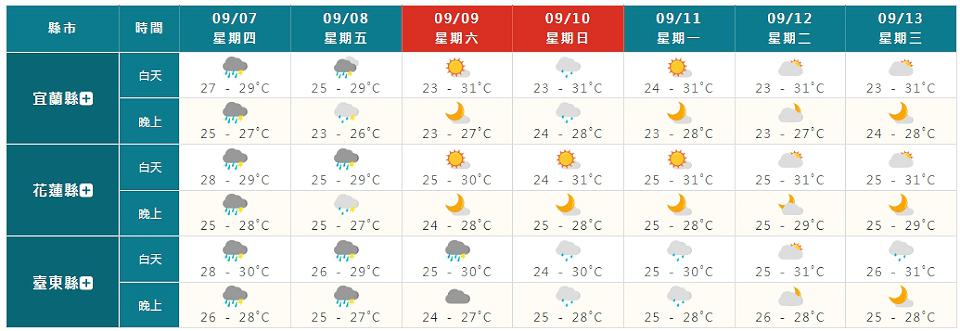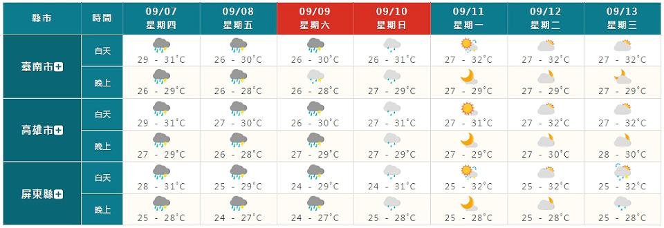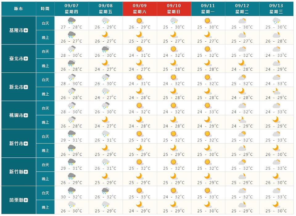 週六(9日)、下週日(10日)為水氣逐漸減少的過程,週六東部、東南部及南部地區有局部短暫陣雨或雷雨,環境轉為東北風,基隆北海岸及東北部地區亦有零星短暫陣雨,其他地區為多雲到晴,午後有局部短暫雷陣雨,南部地區有局部較大雨勢發生的機率;下週日南部及東南部地區有局部短暫陣雨,基隆北海岸、東北部及東部地區亦有零星短暫陣雨,其他地區為多雲到晴,午後中部地區及北部山區有局部短暫雷陣雨。
