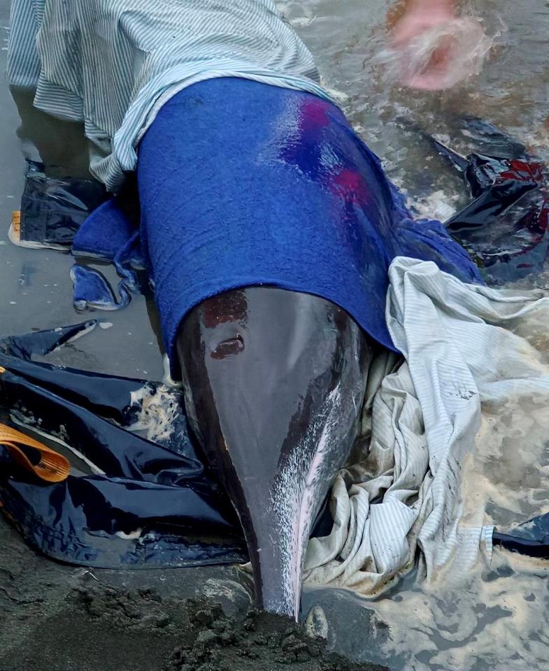 救援人員將擱淺糙齒海豚以布覆蓋保濕。翻攝新北市政府