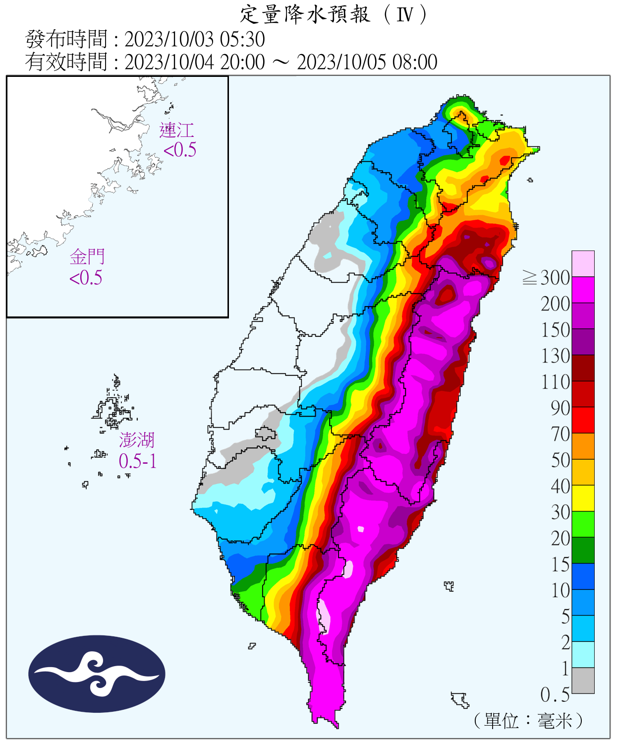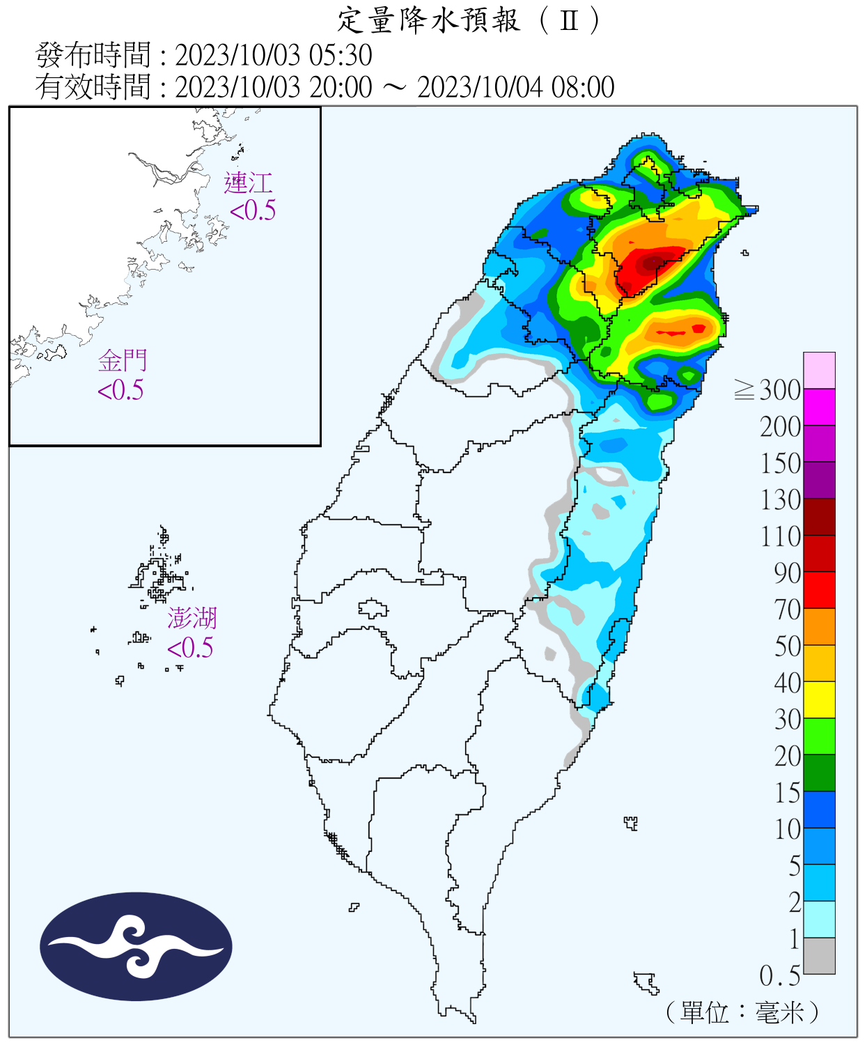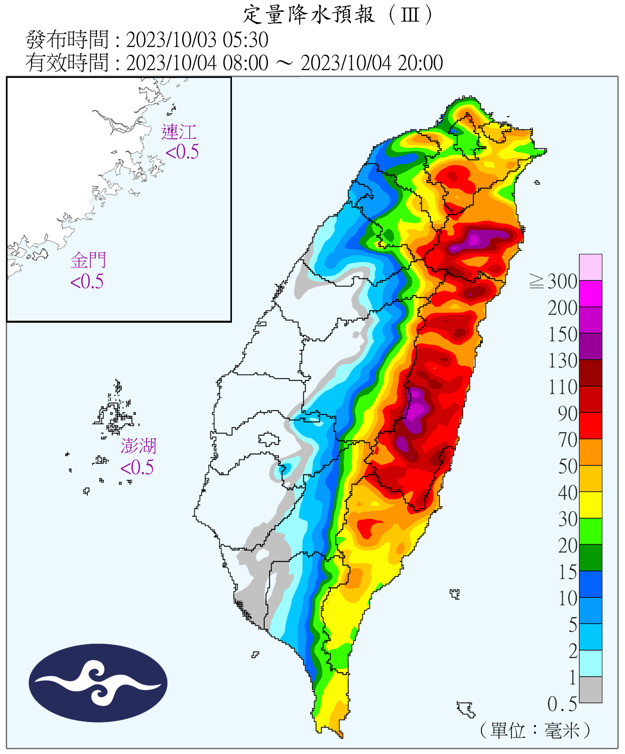 3日台灣附近各海面及巴士海峽風浪逐漸增大,尤其東半部、蘭嶼、綠島及恆春半島沿海,將有4米以上浪高,基隆北海岸、東半部、蘭嶼、綠島、恆春半島及馬祖易有長浪發生,請避免前往海邊活動。