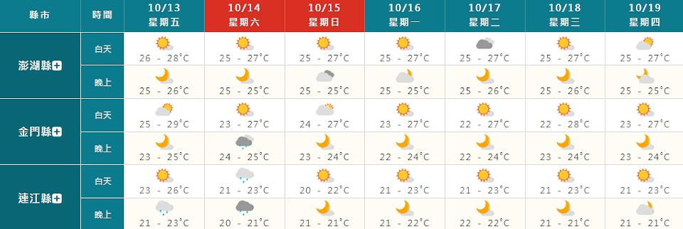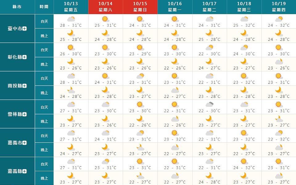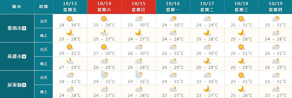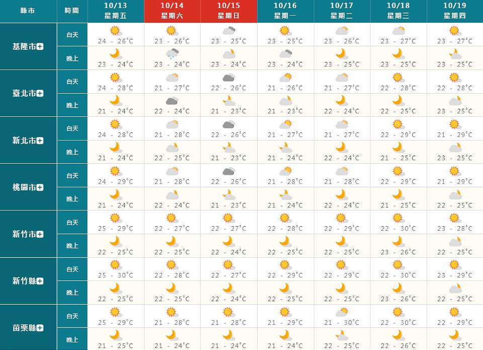 週六(14日)東北季風弱、水氣少,各地為多雲到晴,僅東半部地區及基隆北海岸有零星短暫雨,午後南部地區及中部山區有局部短暫雷陣雨。