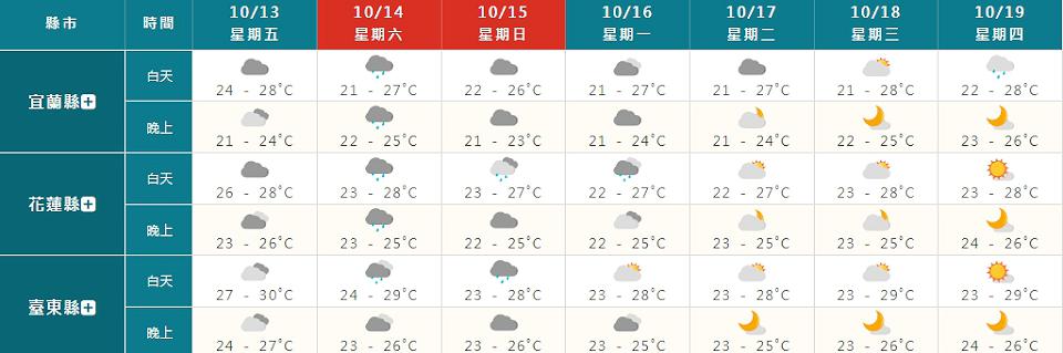週日(15日)東北季風稍增強,迎風面降雨區域擴大,桃園以北、東半部地區及北部山區有局部短暫雨,其他地區為多雲到晴,午後南部地區及中部山區有局部短暫雷陣雨。