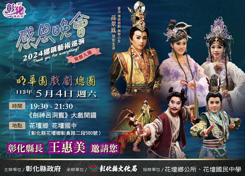 另外,「2024感恩晚會-鄉鎮藝術巡演」系列活動,邀請由無敵小生孫翠鳳老師領銜主演的「明華園戲劇總團」帶來盛大演出,5月4日(六) 在花壇鄉花壇國中,劇碼為《劍神呂洞賓》;5月5日(日)在埔心鄉兒童公園旁草地則帶來《曹國舅上蓬萊》,演出皆於晚間7點30分開始,歡迎鄉親闔家蒞臨觀賞。