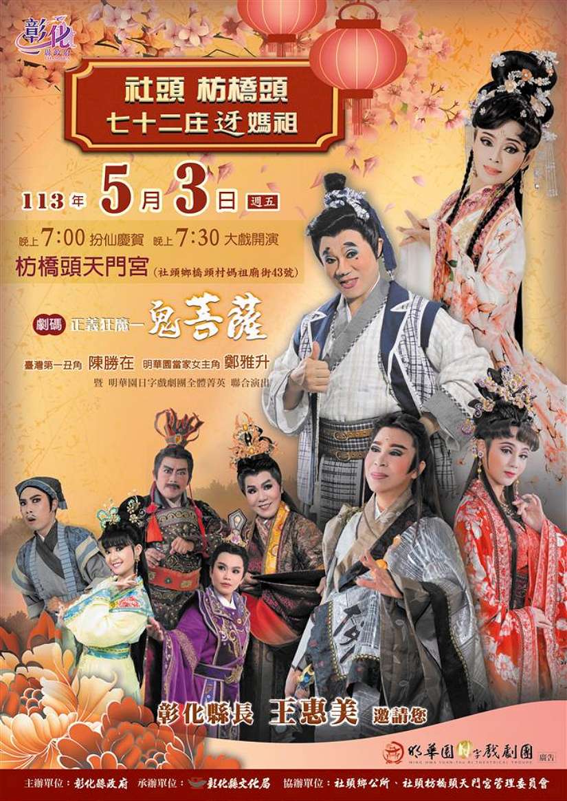 首先為慶賀「社頭枋橋頭七十二庄迓媽祖」將於5月7日起駕前往鹿港天后宮朝聖進香,在起駕前夕,彰化縣政府特擇於5月3日(五)在社頭鄉枋橋頭天門宮,由「台灣第一丑角」 陳勝在帶領「明華園日字戲劇團」演出經典大戲《鬼菩薩》。