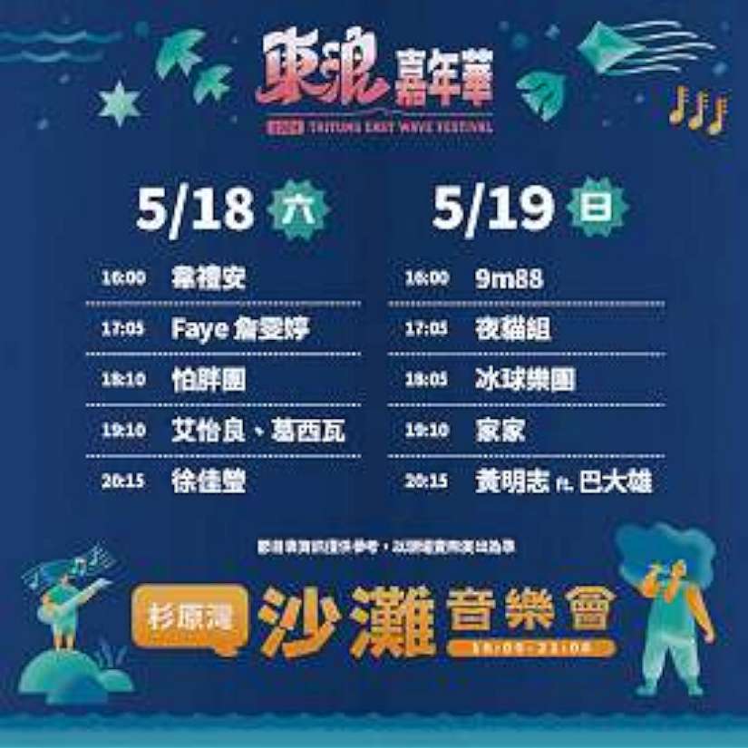 另外,民眾及遊客眾所期待的沙灘音樂會也將在下午4點重磅登場,包括韋禮安、Faye詹雯婷、怕胖團、葛西瓦×艾怡良、徐佳瑩、夜貓組、9M88、冰球樂團、家家及黃明志feat.巴大雄等重量級卡司,演出陣容不容小覷,其中,葛西瓦╳艾怡良及黃明志feat.巴大雄更將首度同台飆唱!活動精采可期,歡迎民眾從白天一路暢玩到黑夜。臺東縣政府也特別提醒,因應沙灘音樂會,杉原灣海域調整開放時間至下午4點。