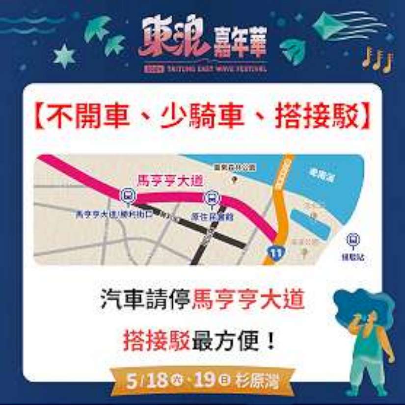 臺東縣政府再次強調,會場不提供汽車停車位,請民眾將汽車停放在馬亨亨大道,搭乘「接駁車」到會場。接駁服務為5月18日及19日上午9點起以巡迴接駁停靠馬亨亨大道/勝利街口、馬亨亨大道/中山路口(原住民會館)及杉原灣,14:00前班距約30分一班,14:00後班距約10-15分一班,進場末班車將於20:00自馬亨亨大道/勝利街口發車;離場接駁自09:30起至23:00直至民眾散場完畢,歡迎民眾多加利用接駁車往返。
