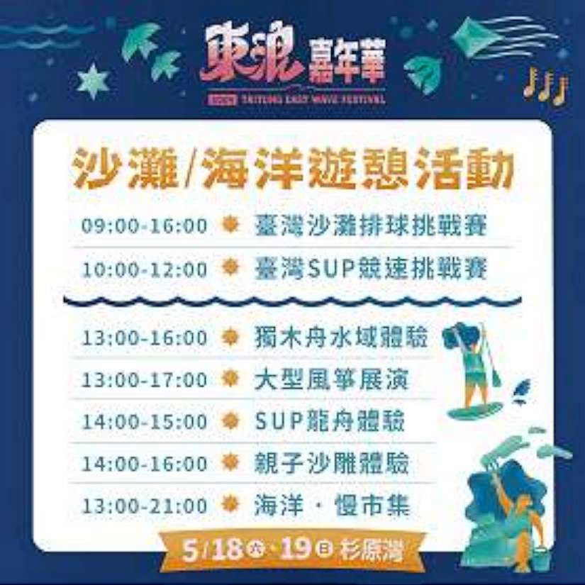 臺東縣政府表示,海陸兩大賽事【SUP競速賽】和【沙灘排球賽】,將從活動首(18)日上午9點起正式展開,提供運動愛好者一展身手、交流切磋。下午1點開始,現場將有海洋慢市集、獨木舟體驗,以及小朋友喜愛的大型風箏展演。而自下午2點,SUP體驗與親子沙雕體驗也將讓民眾玩得盡興。