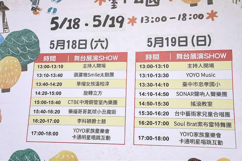 新聞局表示,「台中親子音樂季」邁入第7屆,首度移至百年台中公園舉辦,以「孩享玩樂 聚樂FUN送」為活動主軸,邀請14組表演團體輪番上陣帶來精彩演出,包含YOYO家族太鼓表演、草帽女孩溫柏淳、旋轉立方、CTBE中灣銅管室內樂團、SONAR聲吶人聲樂團、李科穎爵士鼓、台中市忠孝國小、搖滾教室、台中藝術家兒童合唱團、葫蘆墩Smile太鼓團、樂福哥哥氣球小丑魔術、Soul Brat索布雷特舞團,與親子同歡。