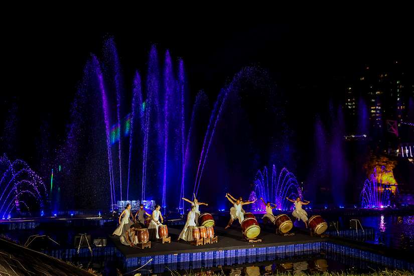 國際級的臺灣品牌團隊「優人神鼓」,首度與水舞攜手展演人水共舞,為碧潭水舞注入新生命 圖/新北市政府提供