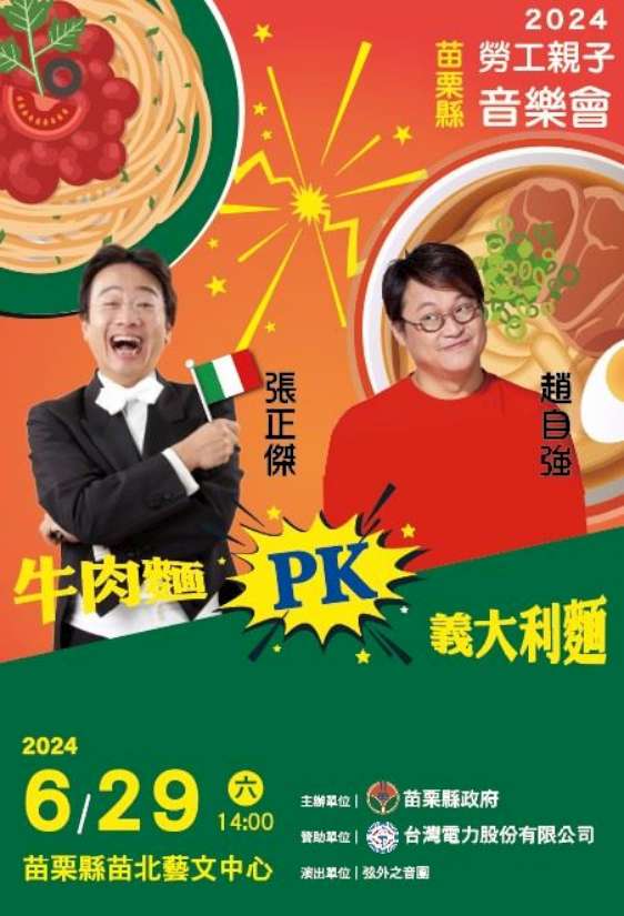 為感謝勞工朋友對苗栗縣經濟發展的貢獻,苗栗縣政府特別向台灣電力股份有限公司爭取經費,將於6月29日(星期六)下午2時在苗北藝文中心演藝廳舉辦「苗栗縣勞工親子音樂會」。本次活動特邀鬼才音樂家張正傑攜手團隊,為勞工朋友們打造一場獨一無二的親子音樂盛宴。