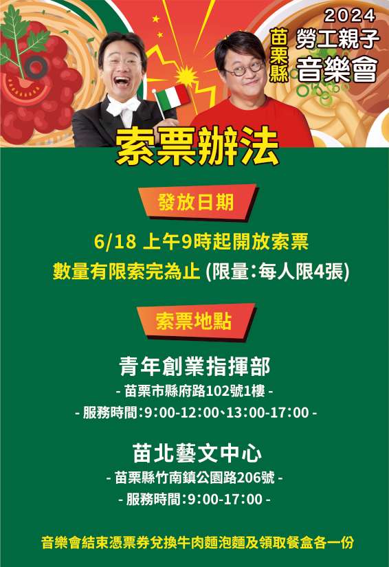 本次音樂會均免費索票入場。自6月18日上午9時起開放索票,每人限索四張。索票地點包括青年創業指揮部(苗栗市縣府路102號1樓)和苗北藝文中心(苗栗縣竹南鎮公園路206號)。由於票券數量有限,請大家踴躍索取,切勿錯過這場精彩的音樂會。更多演出資訊可至本府及勞工及青年發展處的官網、臉書查詢。