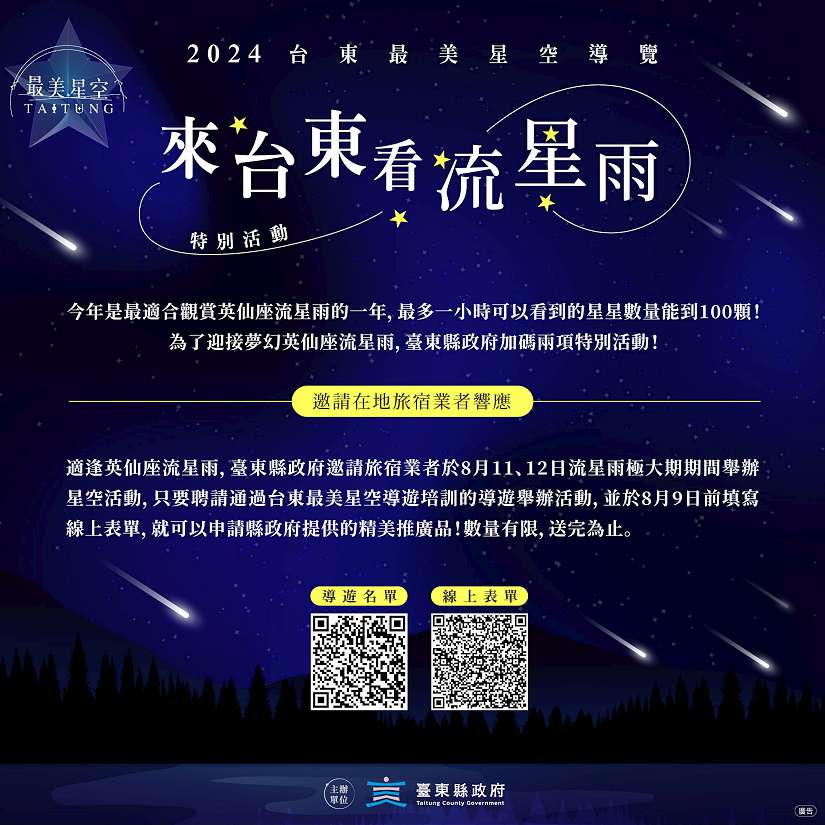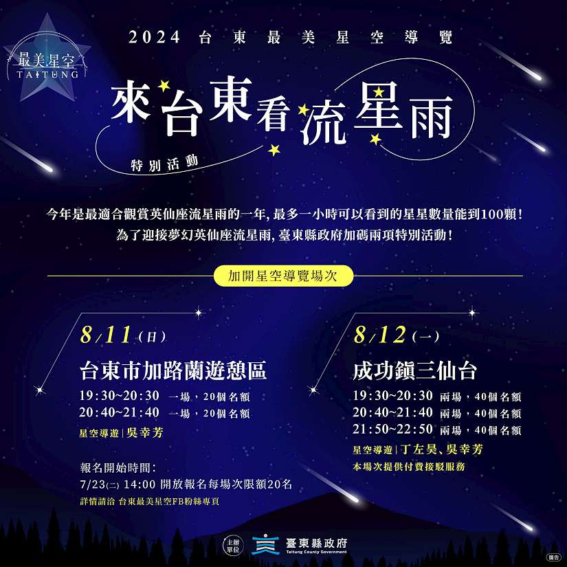 台東縣政府交通及觀光發展處表示,為迎接英仙座流星雨極大期,台東最美星空首次加開深夜場,並首度以雙導遊形式辦理,預計於8月11日加路蘭遊憩區舉辦2時段(19:30~20:30及20:40~21:40)導覽,12日則配合流星雨極大期於三仙台加開3個時段(19:30~20:30、20:40~21:40、21:50~22:50)各兩場次,兩日至少可服務200人參與觀看台東最美星空。